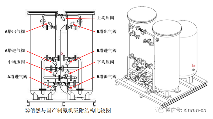 这部分改造涉及到制氮机最核心的环节。传统的吸附塔再生采用的是减压放空模式,也就是把塔内的高压气体直接排放到大气中。这部分气体的压力能就全部损失掉了,而且因为是直接排放,噪音也很大。